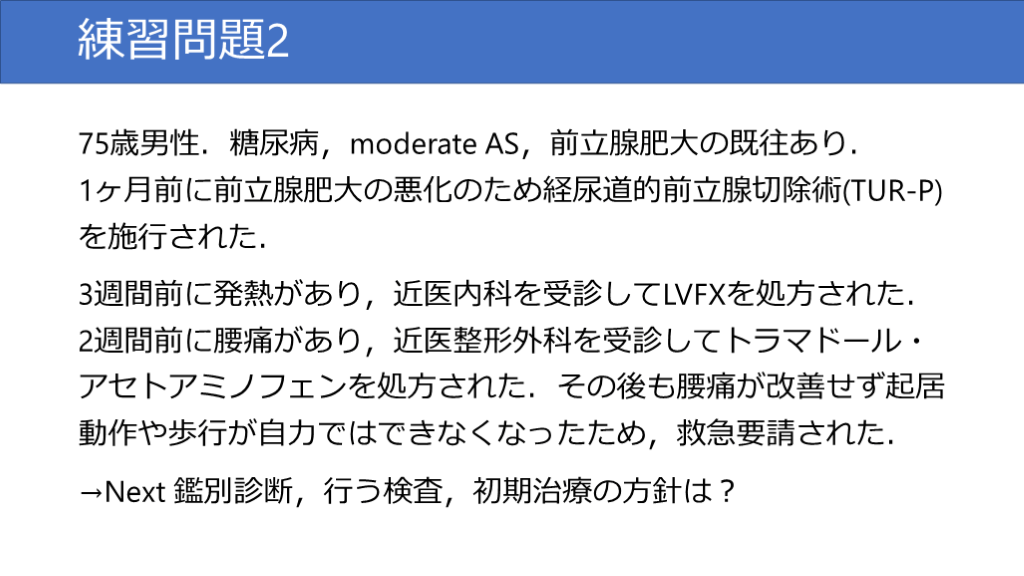 3週間前に発熱があり,近医内科を受診してLVFXを処方された.2週間前に腰痛があり,近医整形外科を受診してトラマドール・アセトアミノフェンを処方された.その後も腰痛が改善せず起居動作や歩行が自力ではできなくなったため,救急要請された.
