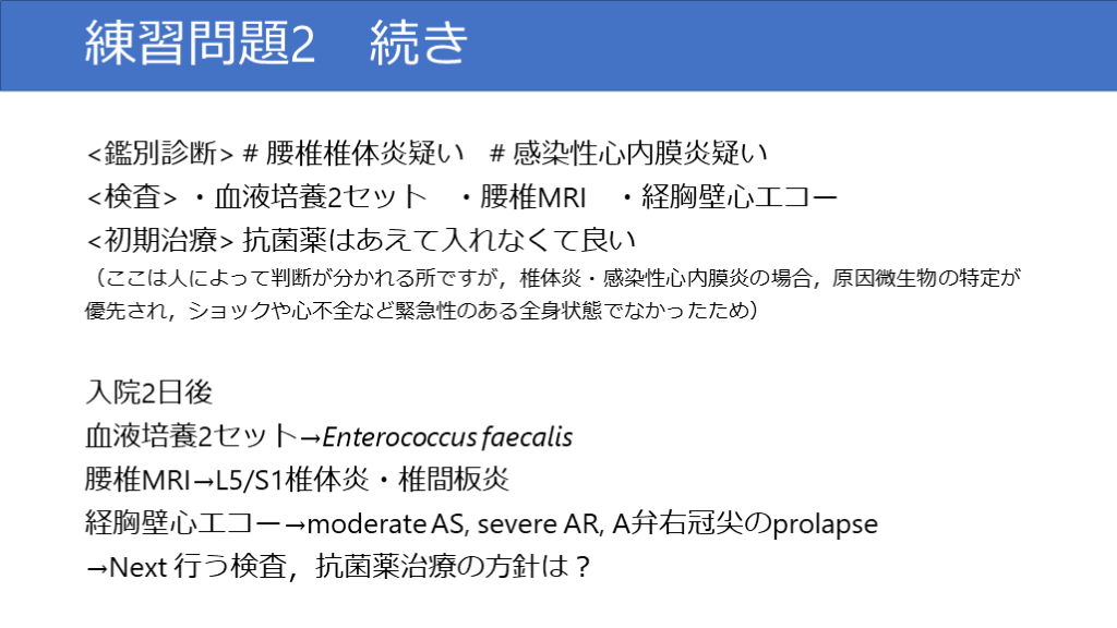 #40. 練習問題2 続き <鑑別診断> # 腰椎椎体炎疑い # 感染性心内膜炎疑い<検査> ・血液培養2セット ・腰椎MRI ・経胸壁心エコー<初期治療> 抗菌薬はあえて入れなくて良い (ここは人によって判断が分かれる所ですが,椎体炎・感染性心内膜炎の場合,原因微生物の特定が優先され,ショックや心不全など緊急性のある全身状態でなかったため)入院2日後血液培養2セット→Enterococcus faecalis腰椎MRI→L5/S1椎体炎・椎間板炎経胸壁心エコー→moderate AS, severe AR, A弁右冠尖のprolapse →Next 行う検査,抗菌薬治療の方針は?