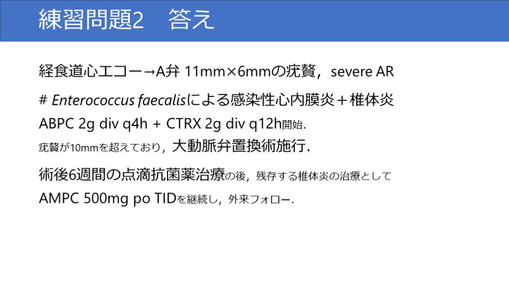 # Enterococcus faecalisによる感染性心内膜炎+椎体炎ABPC 2g div q4h + CTRX 2g div q12h開始.疣贅が10mmを超えており,大動脈弁置換術施行.