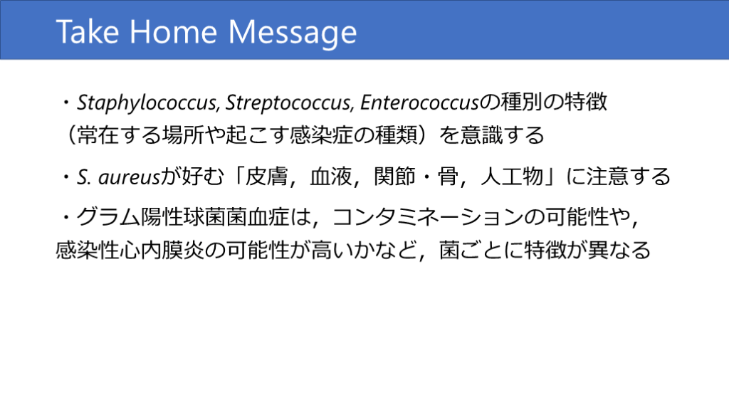 #42. Take Home Message ・Staphylococcus, Streptococcus, Enterococcusの種別の特徴(常在する場所や起こす感染症の種類)を意識する