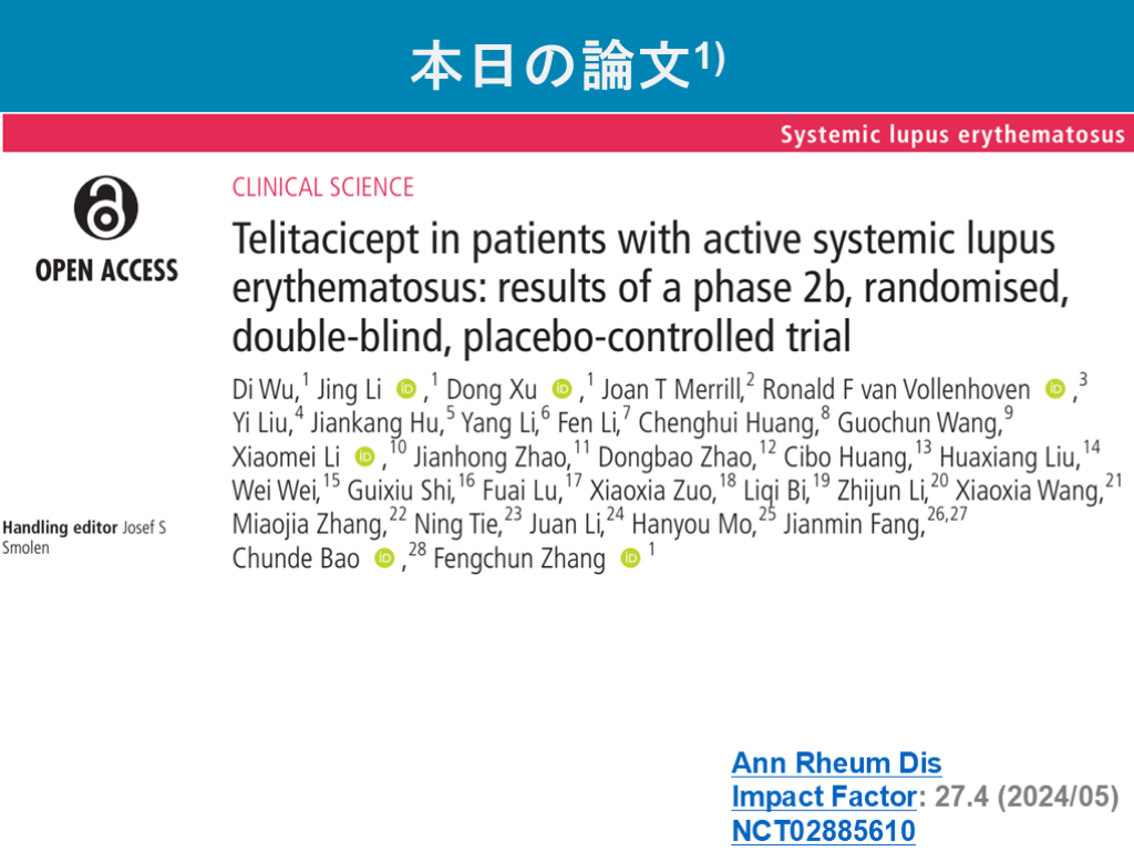 Wu D, Li J, Xu D et al. Telitacicept in patients with active systemic lupus erythematosus: results of a phase 2b, randomised, double-blind, placebo-controlled trial. Ann Rheum Dis. 2024 Mar 12;83(4):475-487. PMID: 38129117