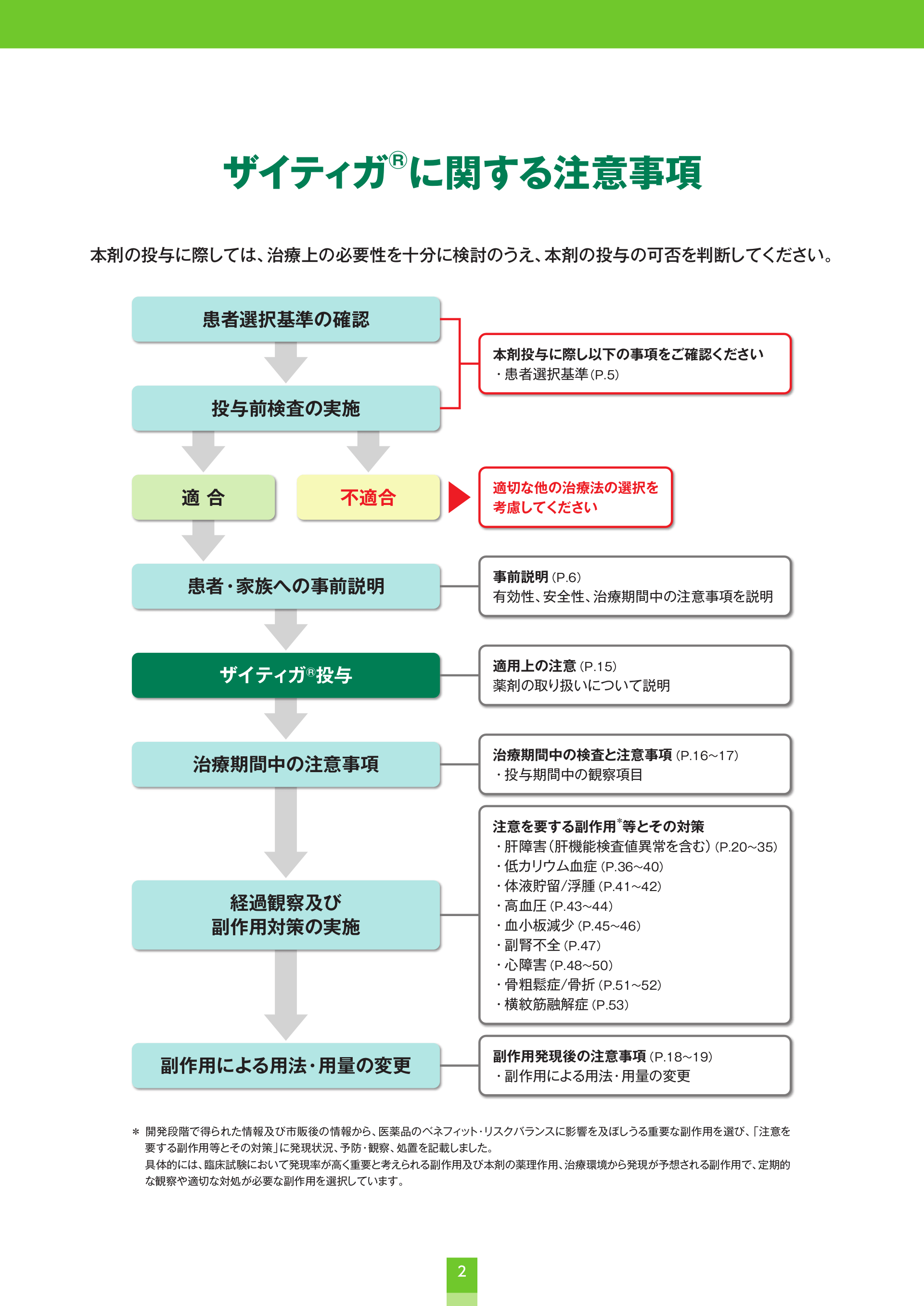 #2. ザイティガ®に関する注意事項 本剤の投与に際しては、治療上の必要性を十分に検討のうえ、本剤の投与の可否を判断してください。 患者選択基準の確認 本剤投与に際し以下の事項をご確認ください ・患者選択基準(P.5) 投与前検査の実施 適合 適切な他の治療法の選択を 考慮してください 不適合 事前説明(P.6) 有効性、安全性、治療期間中の注意事項を説明 患者・家族への事前説明 適用上の注意(P.15) 薬剤の取り扱いについて説明 ザイティガ®投与 治療期間中の検査と注意事項(P.16〜17) ・投与期間中の観察項目 治療期間中の注意事項 * 注意を要する副作用 等とその対策 ・肝障害(肝機能検査値異常を含む) (P.20〜35) ・低カリウム血症(P.36〜40) ・体液貯留/浮腫(P.41〜42) ・高血圧(P.43〜44) ・血小板減少(P.45〜46) ・副腎不全(P.47) ・心障害(P.48〜50) ・骨粗鬆症/骨折(P.51〜52) ・横紋筋融解症(P.53) 経過観察及び 副作用対策の実施 副作用発現後の注意事項(P.18〜19) ・副作用による用法・用量の変更 副作用による用法・用量の変更 * 開発段階で得られた情報及び市販後の情報から、医薬品のベネフィット・リスクバランスに影響を及ぼしうる重要な副作用を選び、 「注意を 要する副作用等とその対策」に発現状況、予防・観察、処置を記載しました。 具体的には、臨床試験において発現率が高く重要と考えられる副作用及び本剤の薬理作用、治療環境から発現が予想される副作用で、定期的 な観察や適切な対処が必要な副作用を選択しています。 2