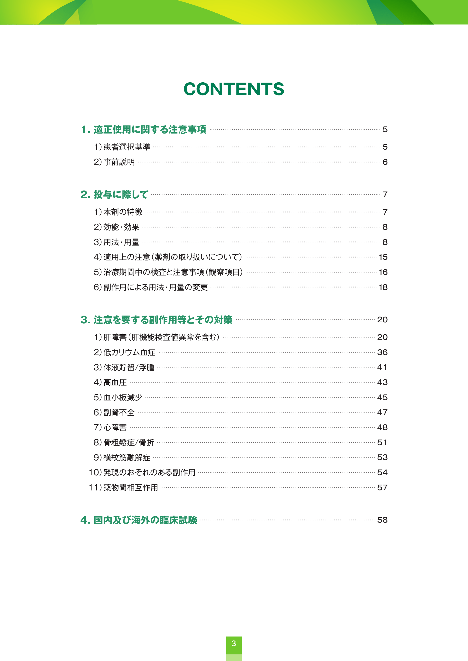 #3. CONTENTS 1. 適正使用に関する注意事項 ・・・・・・・・・・・・・・・・・・・・・・・・・・・・・・・・・・・・・・・・・・・・・・・・・・・・・・・・・・・・・・・・・・・・・・・・・・・・・・・・・・・・・・・・・・・・ 5 ・・・・・・・・・・・・・・・・・・・・・・・・・・・・・・・・・・・・・・・・・・・・・・・・・・・・・・・・・・・・・・・・・・・・・・・・・・・・・・・・・・・・・・・・・・・・・・・・・・・・・・・・・・・・・・・・・・・・・・・・・・ 5 ・・・・・・・・・・・・・・・・・・・・・・・・・・・・・・・・・・・・・・・・・・・・・・・・・・・・・・・・・・・・・・・・・・・・・・・・・・・・・・・・・・・・・・・・・・・・・・・・・・・・・・・・・・・・・・・・・・・・・・・・・・・・・・・・・・ 6 1)患者選択基準 2)事前説明 2. 投与に際して ・・・・・・・・・・・・・・・・・・・・・・・・・・・・・・・・・・・・・・・・・・・・・・・・・・・・・・・・・・・・・・・・・・・・・・・・・・・・・・・・・・・・・・・・・・・・・・・・・・・・・・・・・・・・・・・・・・・・・・・・・・・ 7 ・・・・・・・・・・・・・・・・・・・・・・・・・・・・・・・・・・・・・・・・・・・・・・・・・・・・・・・・・・・・・・・・・・・・・・・・・・・・・・・・・・・・・・・・・・・・・・・・・・・・・・・・・・・・・・・・・・・・・・・・・・・・・・ 7 2)効能・効果 ・・・・・・・・・・・・・・・・・・・・・・・・・・・・・・・・・・・・・・・・・・・・・・・・・・・・・・・・・・・・・・・・・・・・・・・・・・・・・・・・・・・・・・・・・・・・・・・・・・・・・・・・・・・・・・・・・・・・・・・・・・・・・・・・ 8 3)用法・用量 ・・・・・・・・・・・・・・・・・・・・・・・・・・・・・・・・・・・・・・・・・・・・・・・・・・・・・・・・・・・・・・・・・・・・・・・・・・・・・・・・・・・・・・・・・・・・・・・・・・・・・・・・・・・・・・・・・・・・・・・・・・・・・・・・ 8 1)本剤の特徴 4)適用上の注意(薬剤の取り扱いについて) 15 5)治療期間中