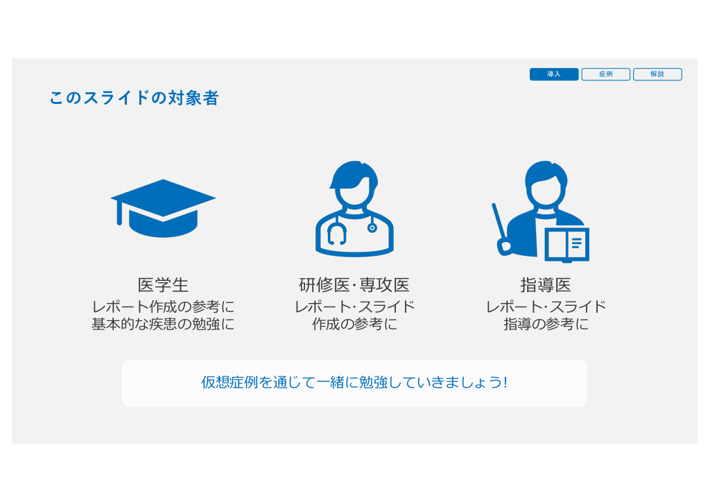 #3. 導入 症例 このスライドの対象者 医学⽣ レポート作成の参考に 基本的な疾患の勉強に 研修医・専攻医 レポート・スライド 作成の参考に 指導医 レポート・スライド 指導の参考に 仮想症例を通じて⼀緒に勉強していきましょう! 解説