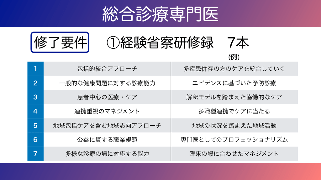 #11. 総合診療専門医 修了要件 ①経験省察研修録 7本 (例) 1 包括的統合アプローチ 多疾患併存の方のケアを統合していく 2 一般的な健康問題に対する診療能力 エビデンスに基づいた予防診療 3 患者中心の医療・ケア 解釈モデルを踏まえた協働的なケア 4 連携重視のマネジメント 多職種連携でケアに当たる 5 地域包括ケアを含む地域志向アプローチ 地域の状況を踏まえた地域活動 6 公益に資する職業規範 専門医としてのプロフェッショナリズム 7 多様な診療の場に対応する能力 臨床の場に合わせたマネジメント