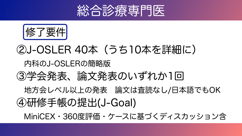 #12. 総合診療専門医 修了要件 ②J-OSLER 40本(うち10本を詳細に) 内科のJ-OSLERの簡略版 ③学会発表、論文発表のいずれか1回 地方会レベル以上の発表 論文は査読なし/日本語でもOK ④研修手帳の提出(J-Goal) MiniCEX・360度評価・ケースに基づくディスカッション含