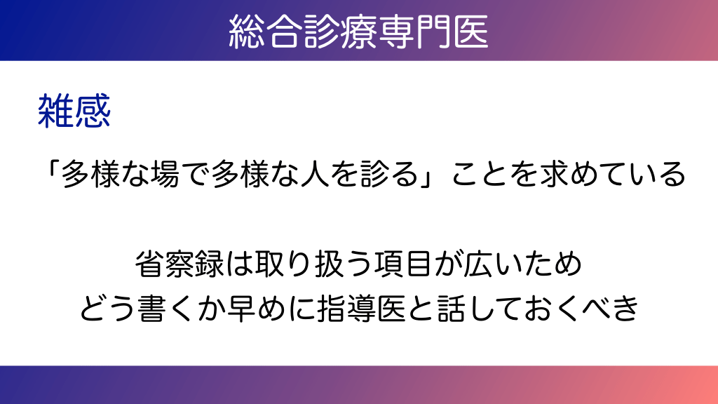 #13. 総合診療専門医 雑感 「多様な場で多様な人を診る」ことを求めている 省察録は取り扱う項目が広いため どう書くか早めに指導医と話しておくべき