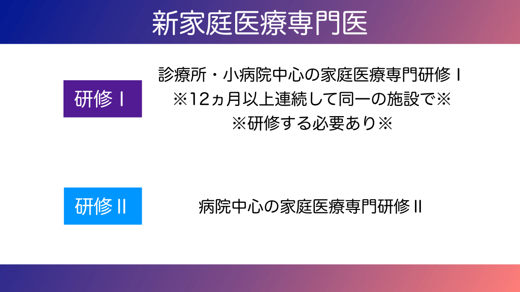 #17. 新家庭医療専門医 研修Ⅰ 診療所・小病院中心の家庭医療専門研修Ⅰ ※12ヵ月以上連続して同一の施設で※ ※研修する必要あり※ 研修Ⅱ 病院中心の家庭医療専門研修Ⅱ