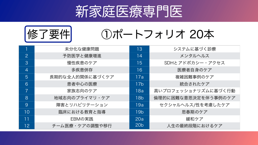 #19. 新家庭医療専門医 修了要件 ①ポートフォリオ 20本 1 未分化な健康問題 13 システムに基づく診療 2 予防医学と健康増進 14 メンタルヘルス 3 慢性疾患のケア 15 SDHとアドボカシー・アクセス 4 多疾患併存 16 医療者自身のケア 5 長期的な全人的関係に基づくケア 17a 複雑困難事例のケア 6 患者中心の医療 17b 統合されたケア 7 家族志向のケア 18a 高いプロフェッショナリズムに基づく行動 8 地域志向のプライマリ・ケア 18b 倫理的に困難な意思決定を伴う事例のケア 9 障害とリハビリテーション 19a セクシャルヘルス/性を考慮したケア 10 臨床における教育と指導 19b 思春期のケア 11 EBMの実践 緩和ケア 12 チーム医療・ケアの調整や移行 20a 20b 人生の最終段階におけるケア