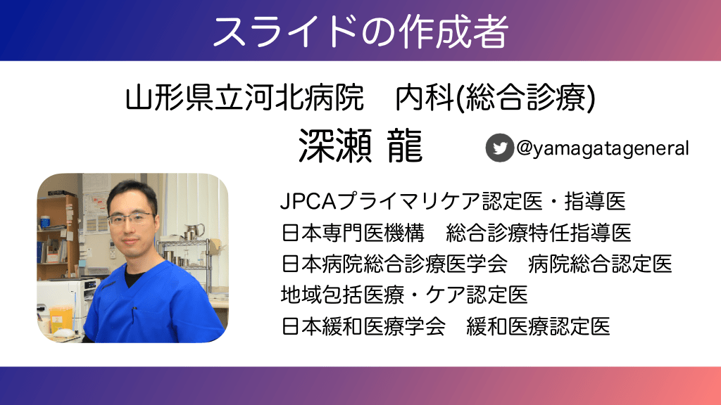 #2. スライドの作成者 山形県立河北病院 内科(総合診療) 深瀬 龍 @yamagatageneral JPCAプライマリケア認定医・指導医 日本専門医機構 総合診療特任指導医 日本病院総合診療医学会 病院総合認定医 地域包括医療・ケア認定医 日本緩和医療学会 緩和医療認定医