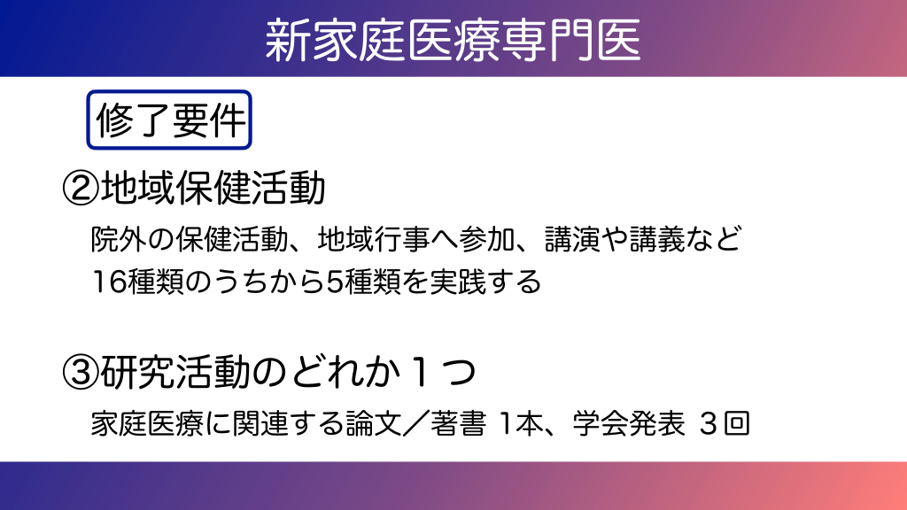 #20. 新家庭医療専門医 修了要件 ②地域保健活動 院外の保健活動、地域行事へ参加、講演や講義など 16種類のうちから5種類を実践する ③研究活動のどれか1つ 家庭医療に関連する論文/著書 1本、学会発表 3回