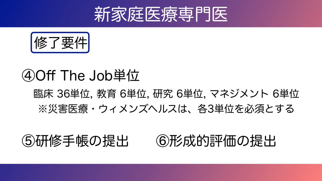 #21. 新家庭医療専門医 修了要件 ④O The Job単位 臨床 36単位, 教育 6単位, 研究 6単位, マネジメント 6単位 ※災害医療・ウィメンズヘルスは、各3単位を必須とする ff ⑤研修手帳の提出 ⑥形成的評価の提出
