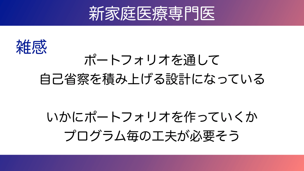 #22. 新家庭医療専門医 雑感 ポートフォリオを通して 自己省察を積み上げる設計になっている いかにポートフォリオを作っていくか プログラム毎の工夫が必要そう