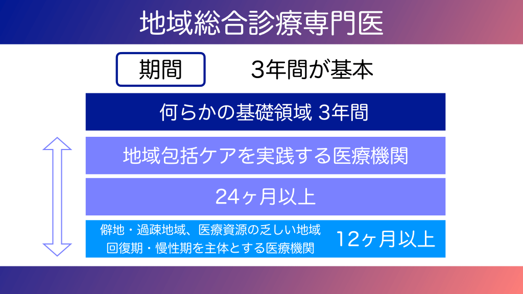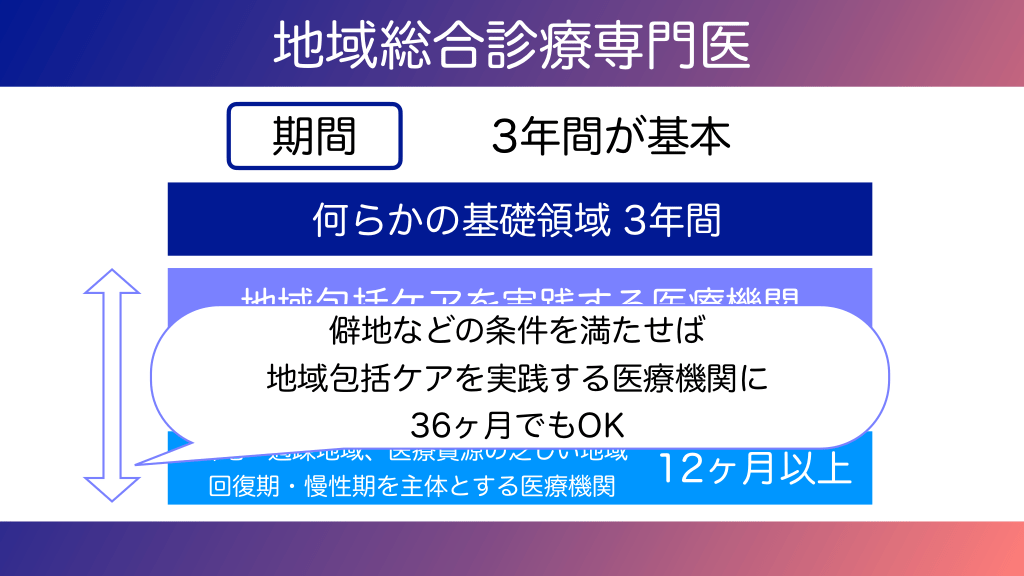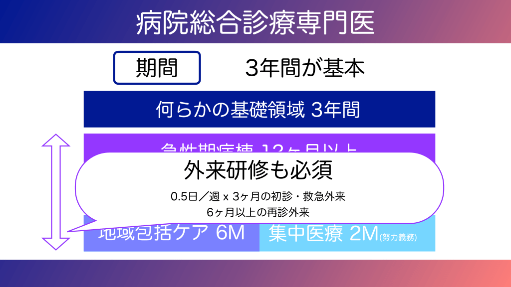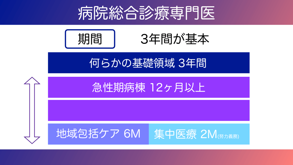 #25. 病院総合診療専門医 期間 3年間が基本 何らかの基礎領域 3年間 急性期病棟 12ヶ月以上 地域包括ケア 6M 集中医療 2M(努力義務)