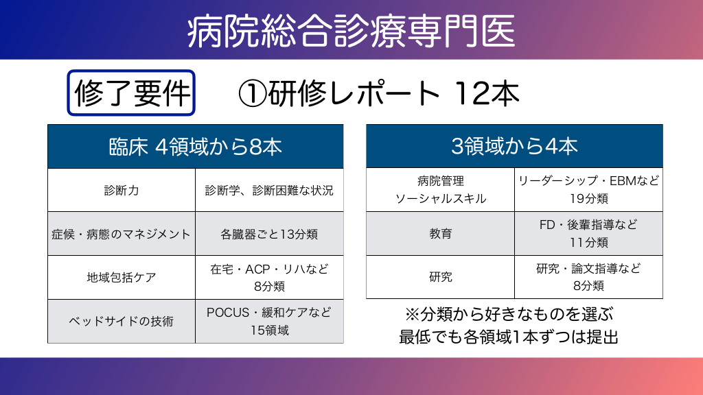 #28. 病院総合診療専門医 修了要件 ①研修レポート 12本 臨床 4領域から8本 診断力 診断学、診断困難な状況 症候・病態のマネジメント 各臓器ごと13分類 地域包括ケア 在宅・ACP・リハなど 8分類 ベッドサイドの技術 POCUS・緩和ケアなど 15領域 3領域から4本 病院管理 ソーシャルスキル リーダーシップ・EBMなど 19分類 教育 FD・後輩指導など 11分類 研究 研究・論文指導など 8分類 ※分類から好きなものを選ぶ 最低でも各領域1本ずつは提出