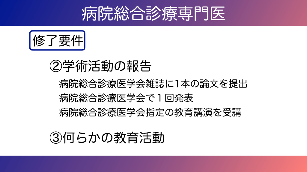 #29. 病院総合診療専門医 修了要件 ②学術活動の報告 病院総合診療医学会雑誌に1本の論文を提出 病院総合診療医学会で1回発表 病院総合診療医学会指定の教育講演を受講 ③何らかの教育活動