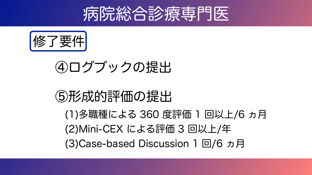 #30. 病院総合診療専門医 修了要件 ④ログブックの提出 ⑤形成的評価の提出 (1)多職種による 360 度評価 1 回以上/6 ヵ月 (2)Mini-CEX による評価 3 回以上/年 (3)Case-based Discussion 1 回/6 ヵ月