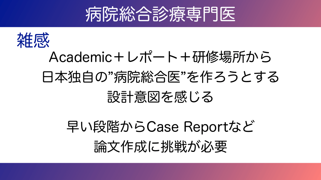 #31. 病院総合診療専門医 雑感 Academic+レポート+研修場所から 日本独自の”病院総合医”を作ろうとする 設計意図を感じる 早い段階からCase Reportなど 論文作成に挑戦が必要