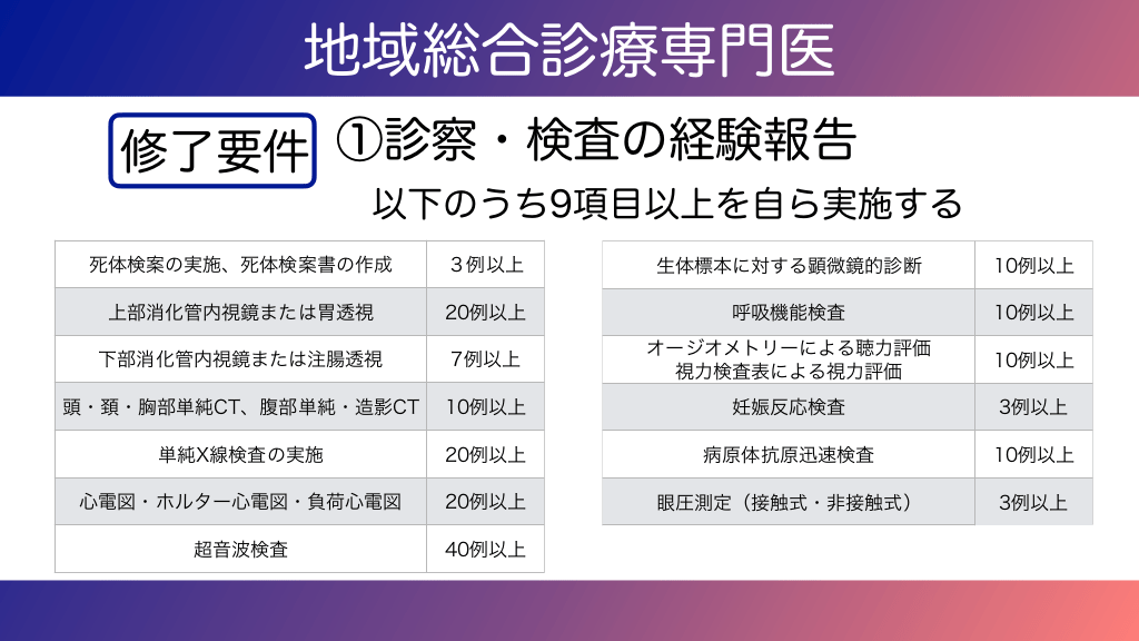 #38. 地域総合診療専門医 ①診察・検査の経験報告 修了要件 以下のうち9項目以上を自ら実施する 死体検案の実施、死体検案書の作成 3例以上 生体標本に対する顕微鏡的診断 10例以上 上部消化管内視鏡または胃透視 20例以上 呼吸機能検査 10例以上 下部消化管内視鏡または注腸透視 7例以上 オージオメトリーによる聴力評価 視力検査表による視力評価 10例以上 頭・頚・胸部単純CT、腹部単純・造影CT 10例以上 妊娠反応検査 3例以上 単純X線検査の実施 20例以上 病原体抗原迅速検査 10例以上 心電図・ホルター心電図・負荷心電図 20例以上 眼圧測定(接触式・非接触式) 3例以上 超音波検査 40例以上