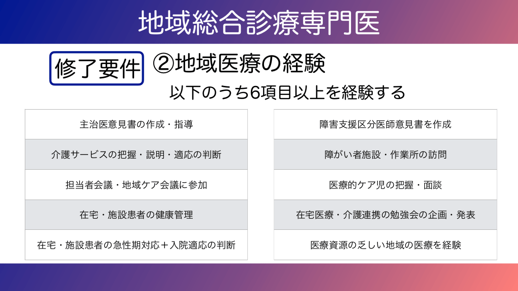 #39. 地域総合診療専門医 ②地域医療の経験 修了要件 以下のうち6項目以上を経験する 主治医意見書の作成・指導 障害支援区分医師意見書を作成 介護サービスの把握・説明・適応の判断 障がい者施設・作業所の訪問 担当者会議・地域ケア会議に参加 医療的ケア児の把握・面談 在宅・施設患者の健康管理 在宅医療・介護連携の勉強会の企画・発表 在宅・施設患者の急性期対応+入院適応の判断 医療資源の乏しい地域の医療を経験