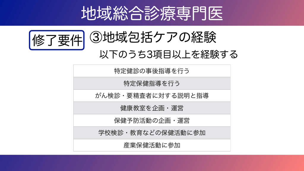 #40. 地域総合診療専門医 ③地域包括ケアの経験 修了要件 以下のうち3項目以上を経験する 特定健診の事後指導を行う 特定保健指導を行う がん検診・要精査者に対する説明と指導 健康教室を企画・運営 保健予防活動の企画・運営 学校検診・教育などの保健活動に参加 産業保健活動に参加