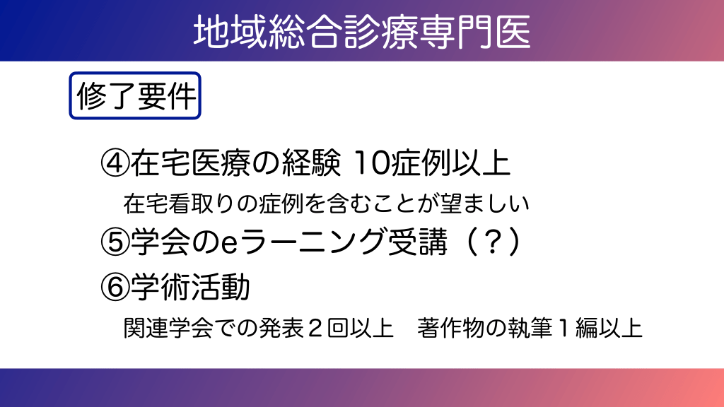 #41. 地域総合診療専門医 修了要件 ④在宅医療の経験 10症例以上 在宅看取りの症例を含むことが望ましい ⑤学会のeラーニング受講(?) ⑥学術活動 関連学会での発表2回以上 著作物の執筆1編以上
