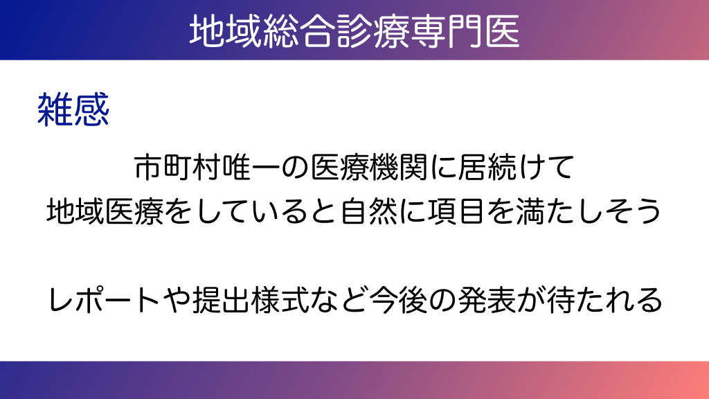 #42. 地域総合診療専門医 雑感 市町村唯一の医療機関に居続けて 地域医療をしていると自然に項目を満たしそう レポートや提出様式など今後の発表が待たれる