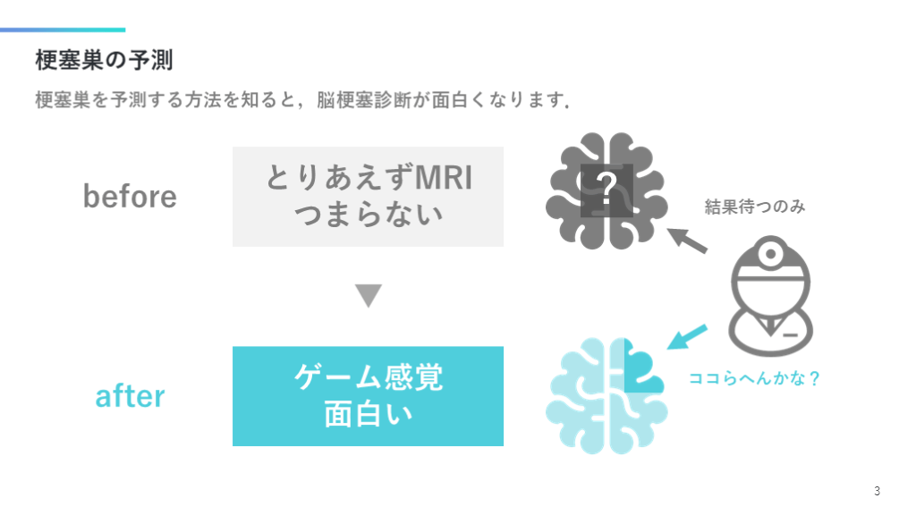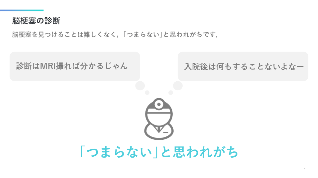 #3. 診断はMRI撮れば分かるじゃん 脳梗塞の診断 脳梗塞を見つけることは難しくなく,「つまらない」と思われがちです. 入院後は何もすることないよなー 2 「つまらない」と思われがち