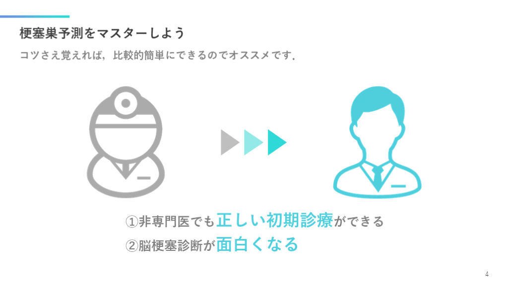 #5. 梗塞巣予測をマスターしよう コツさえ覚えれば,比較的簡単にできるのでオススメです. 4 ①非専門医でも正しい初期診療ができる