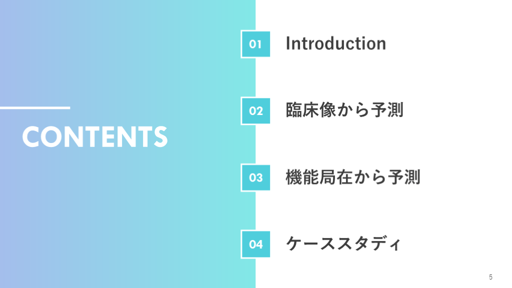 #6. CONTENTS 5 Introduction 臨床像から予測 機能局在から予測 ケーススタディ 01 02 03 04