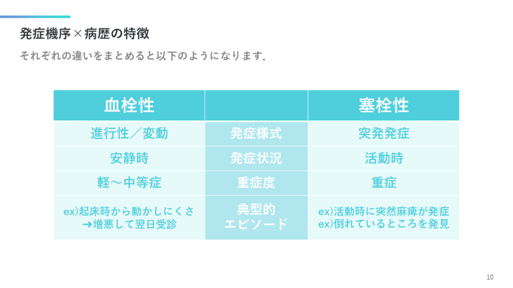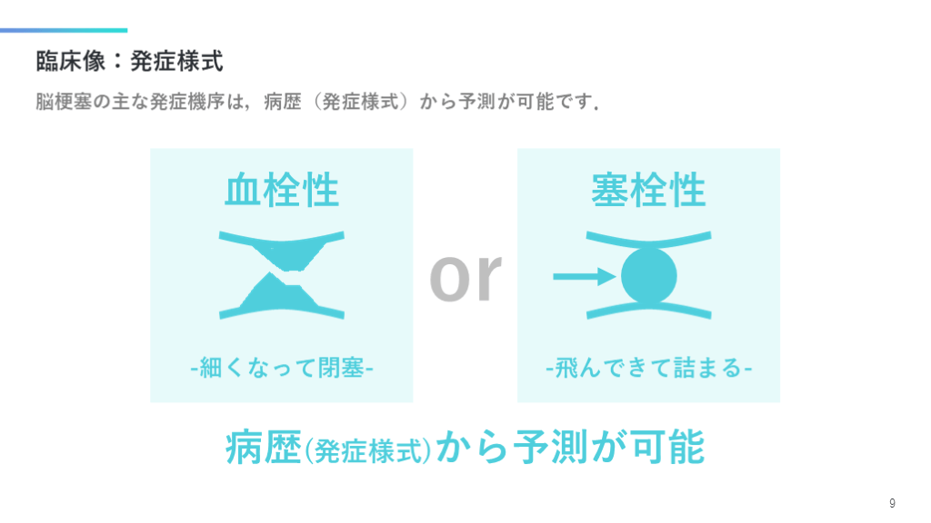 #10. 臨床像:発症様式 脳梗塞の主な発症機序は,病歴(発症様式)から予測が可能です. 9 血栓性