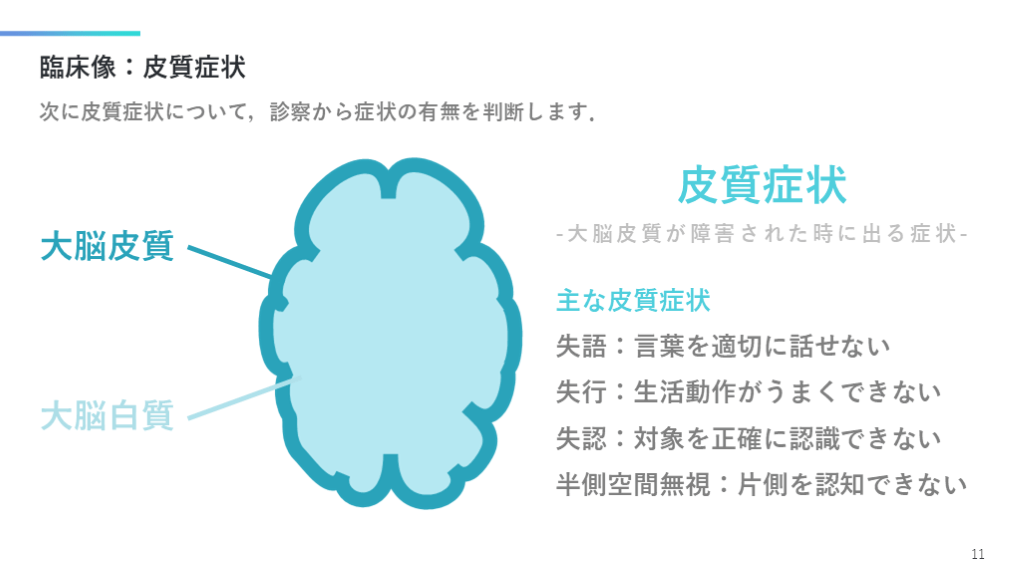 #12. 臨床像:皮質症状 次に皮質症状について,診察から症状の有無を判断します. 11 大脳皮質 大脳白質 主な皮質症状