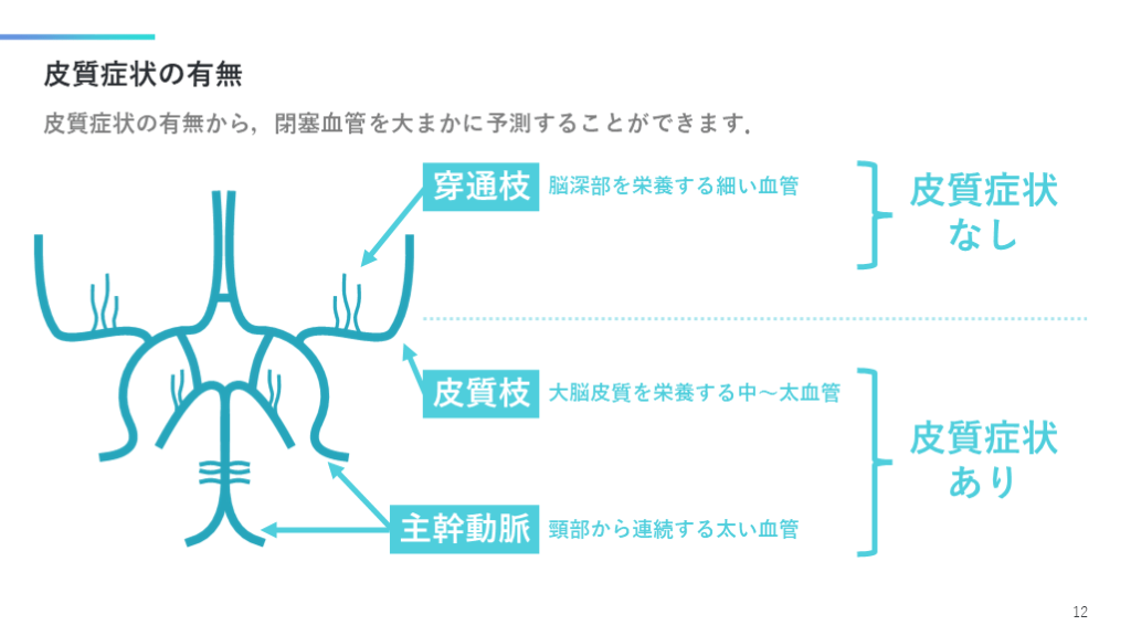 #13. 皮質症状の有無 皮質症状の有無から,閉塞血管を大まかに予測することができます. 12 主幹動脈 穿通枝 皮質枝 頸部から連続する太い血管 脳深部を栄養する細い血管 大脳皮質を栄養する中〜太血管 皮質症状