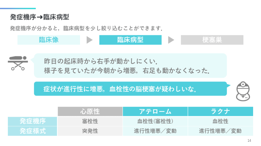#15. 発症機序が分かると,臨床病型を少し絞り込むことができます. 14 発症機序➜臨床病型 臨床像 臨床病型 梗塞巣 昨日の起床時から右手が動かしにくい.