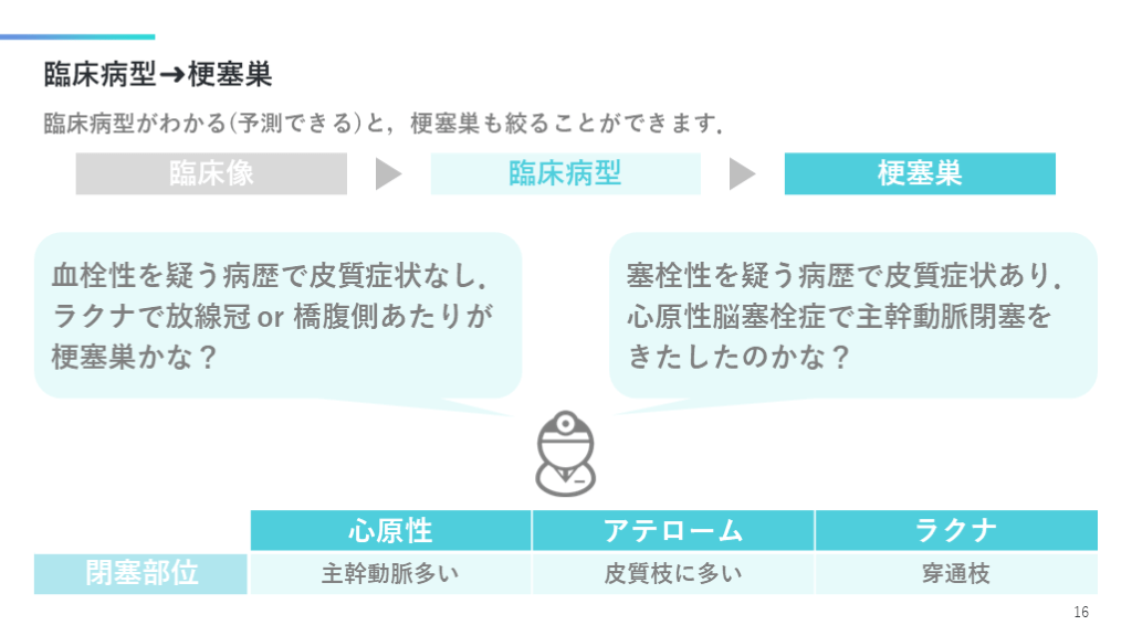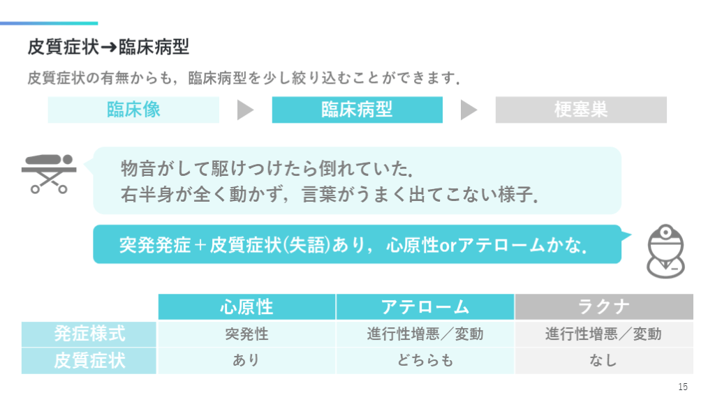 #16. 皮質症状の有無からも,臨床病型を少し絞り込むことができます. 15 皮質症状➜臨床病型 臨床像 臨床病型 梗塞巣 物音がして駆けつけたら倒れていた.