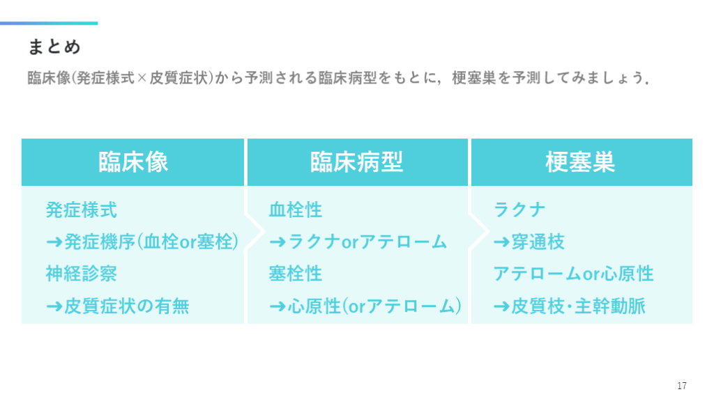 #18. 臨床像(発症様式×皮質症状)から予測される臨床病型をもとに,梗塞巣を予測してみましょう. 17 まとめ