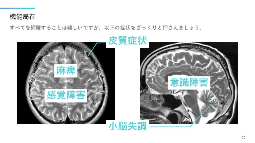 #21. 機能局在 すべてを網羅することは難しいですが,以下の症状をざっくりと押さえましょう. 20 麻痺 感覚障害 小脳失調 意識障害 皮質症状