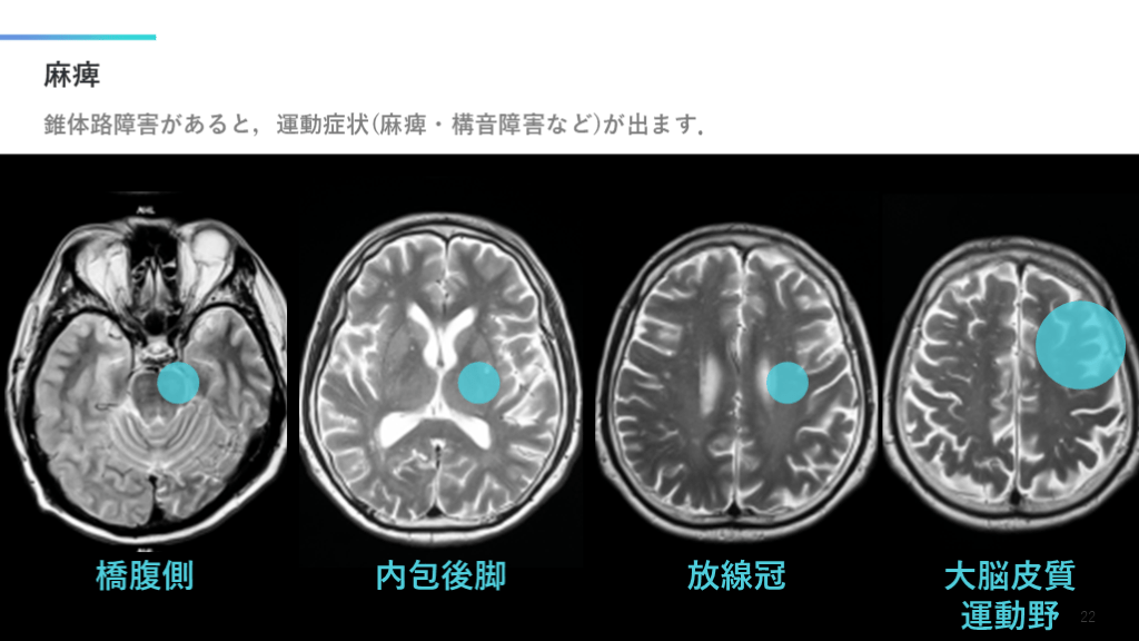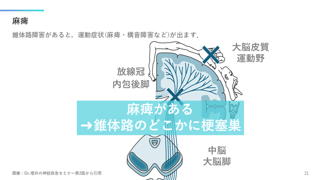 #22. 麻痺 21 錐体路障害があると,運動症状(麻痺・構音障害など)が出ます. 内包後脚 放線冠 中脳