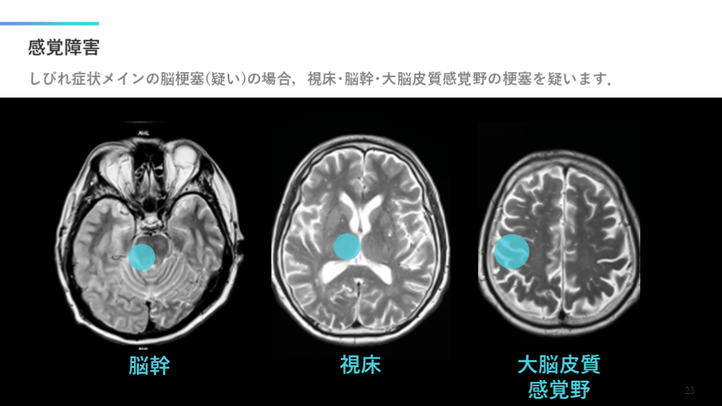 #24. 感覚障害 しびれ症状メインの脳梗塞(疑い)の場合,視床・脳幹・大脳皮質感覚野の梗塞を疑います. 23 大脳皮質