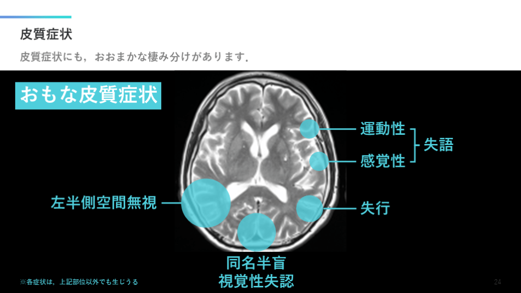 #25. 皮質症状 皮質症状にも,おおまかな棲み分けがあります. ※各症状は,上記部位以外でも生じうる 24 運動性 感覚性 失語 同名半盲