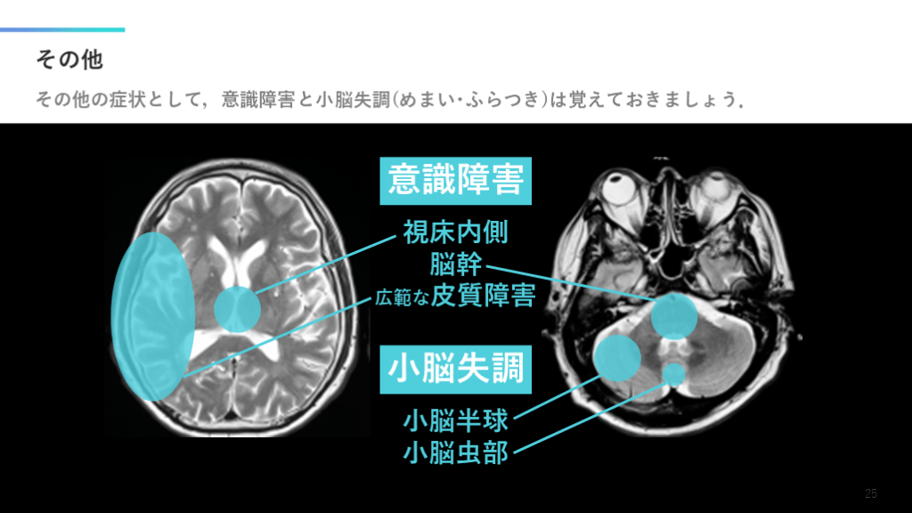 #26. その他 その他の症状として,意識障害と小脳失調(めまい・ふらつき)は覚えておきましょう. 25 視床内側
