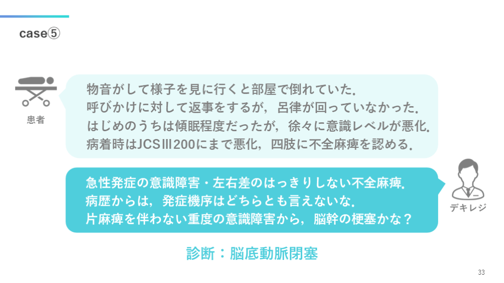 片麻痺を伴わない重度の意識障害から,脳幹の梗塞かな? 患者 デキレジ 診断:脳底動脈閉塞