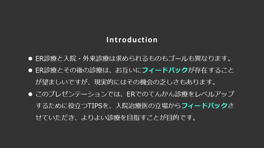 このプレゼンテーションでは、ERでのてんかん診療をレベルアップするために役立つTIPSを、入院治療医の立場からフィードバックさせていただき、よりよい診療を目指すことが目的です。