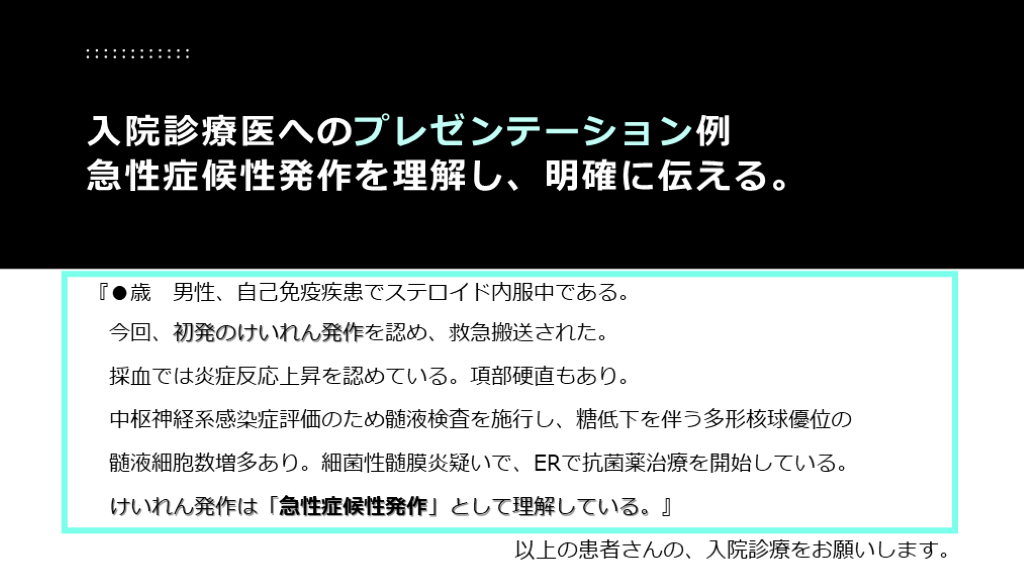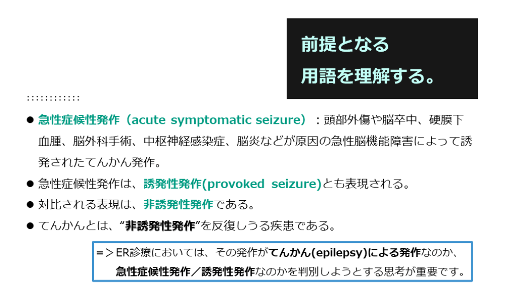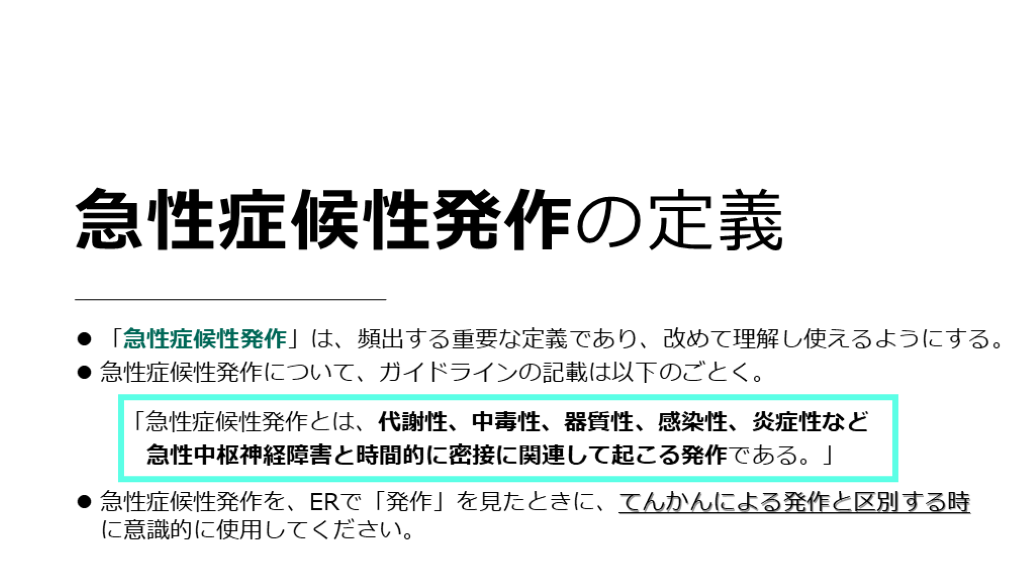 急性症候性発作を、ERで「発作」を見たときに、てんかんによる発作と区別する時に意識的に使用してください。