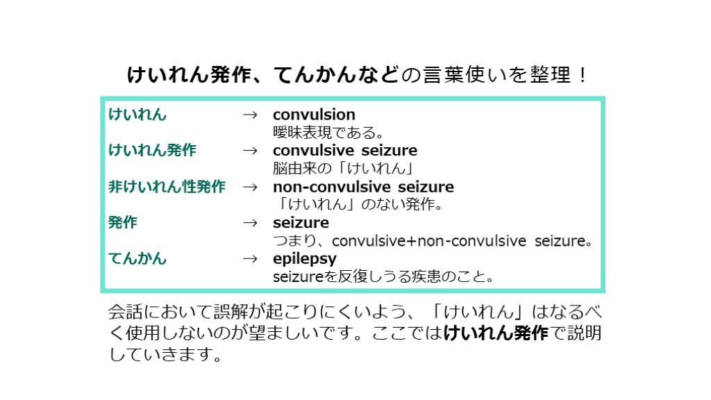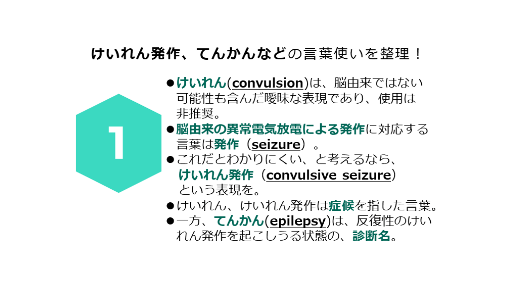 #6. けいれん発作、てんかんなどの言葉使いを整理! 1 けいれん(convulsion)は、脳由来ではない可能性も含んだ曖昧な表現であり、使用は 非推奨。