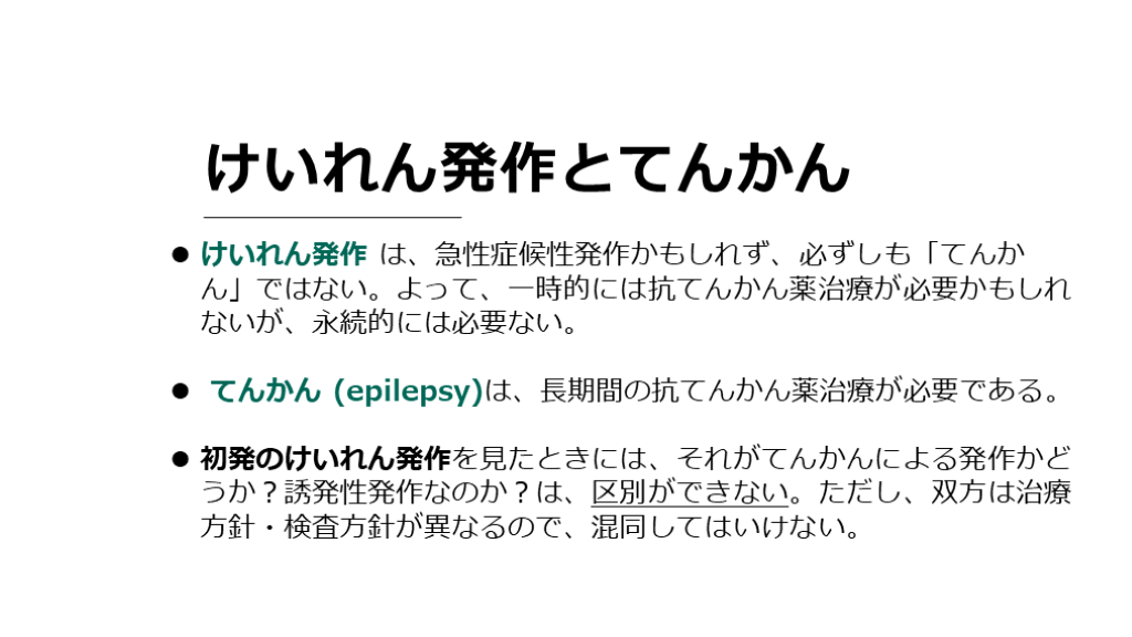 初発のけいれん発作を見たときには、それがてんかんによる発作かどうか?誘発性発作なのか?は、区別ができない。ただし、双方は治療方針・検査方針が異なるので、混同してはいけない。