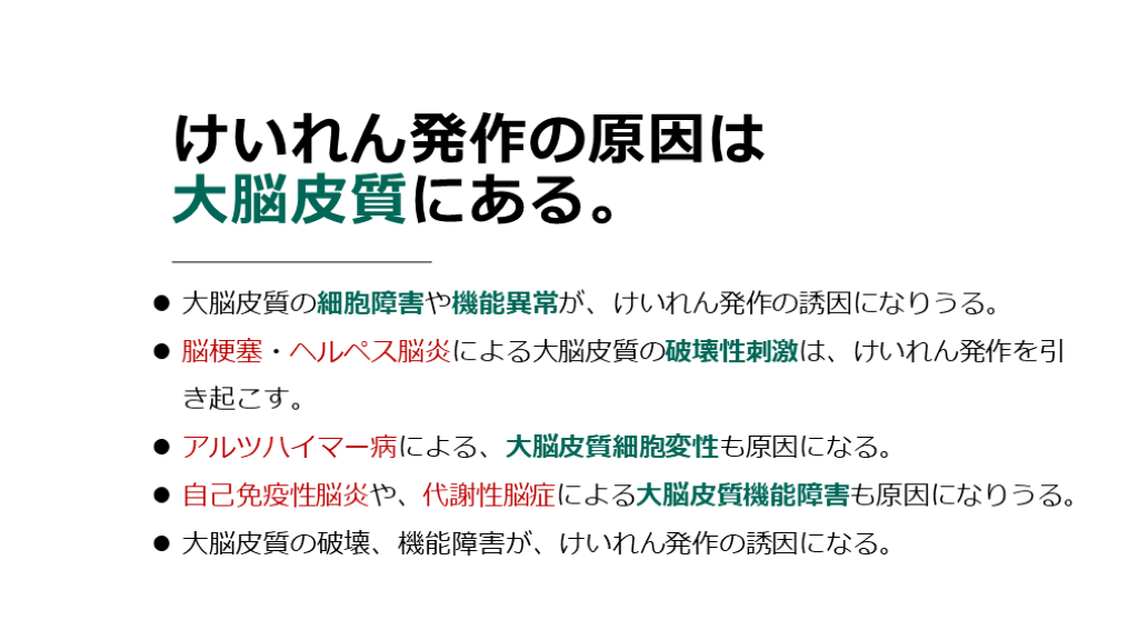 大脳皮質の破壊、機能障害が、けいれん発作の誘因になる。