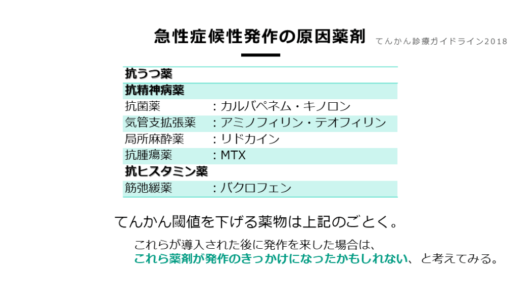 これら薬剤が発作のきっかけになったかもしれない、と考えてみる。 てんかん診療ガイドライン2018