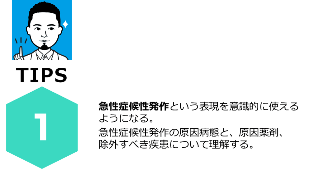 急性症候性発作の原因病態と、原因薬剤、 除外すべき疾患について理解する。 TIPS 1