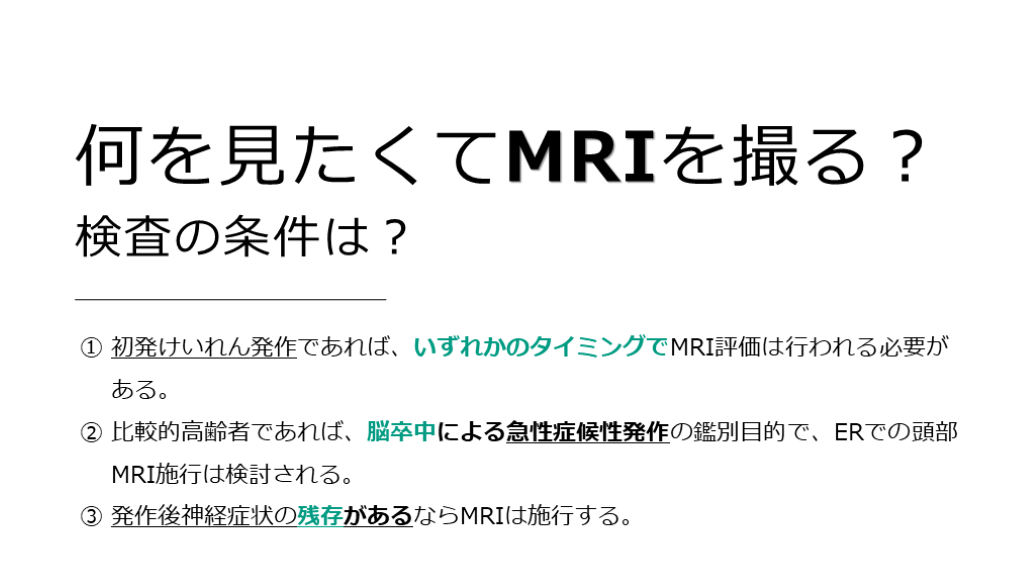 検査の条件は? 初発けいれん発作であれば、いずれかのタイミングでMRI評価は行われる必要がある。